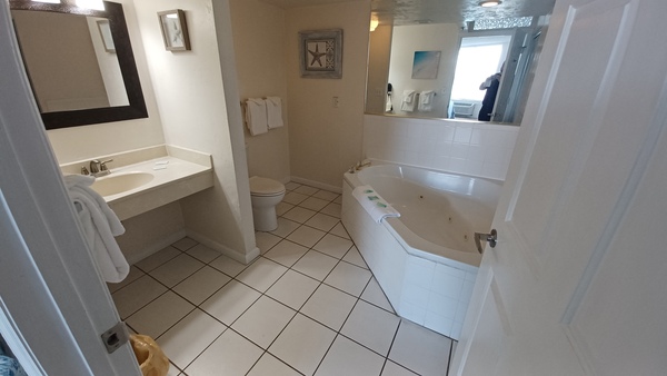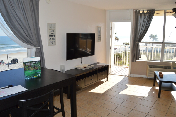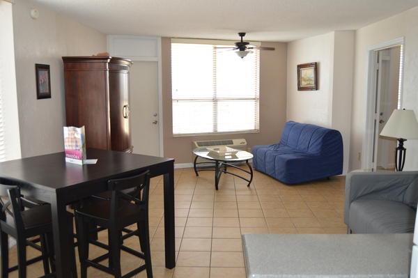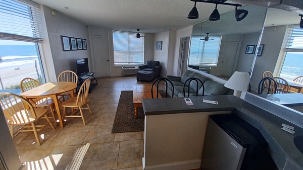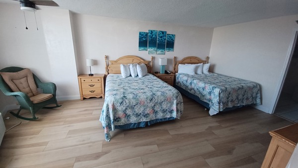 OCEAN FRONT SUITE has a full view of the ocean. It comes living room, full bath and a fully equipped kitchen. Separate bedroom with 2 queen beds a second full bath. Kitchen offers a sink, resort size range with oven, microwave, full size refrigerator, coffee maker, dishes, utensils cookware, 2 private balconies.